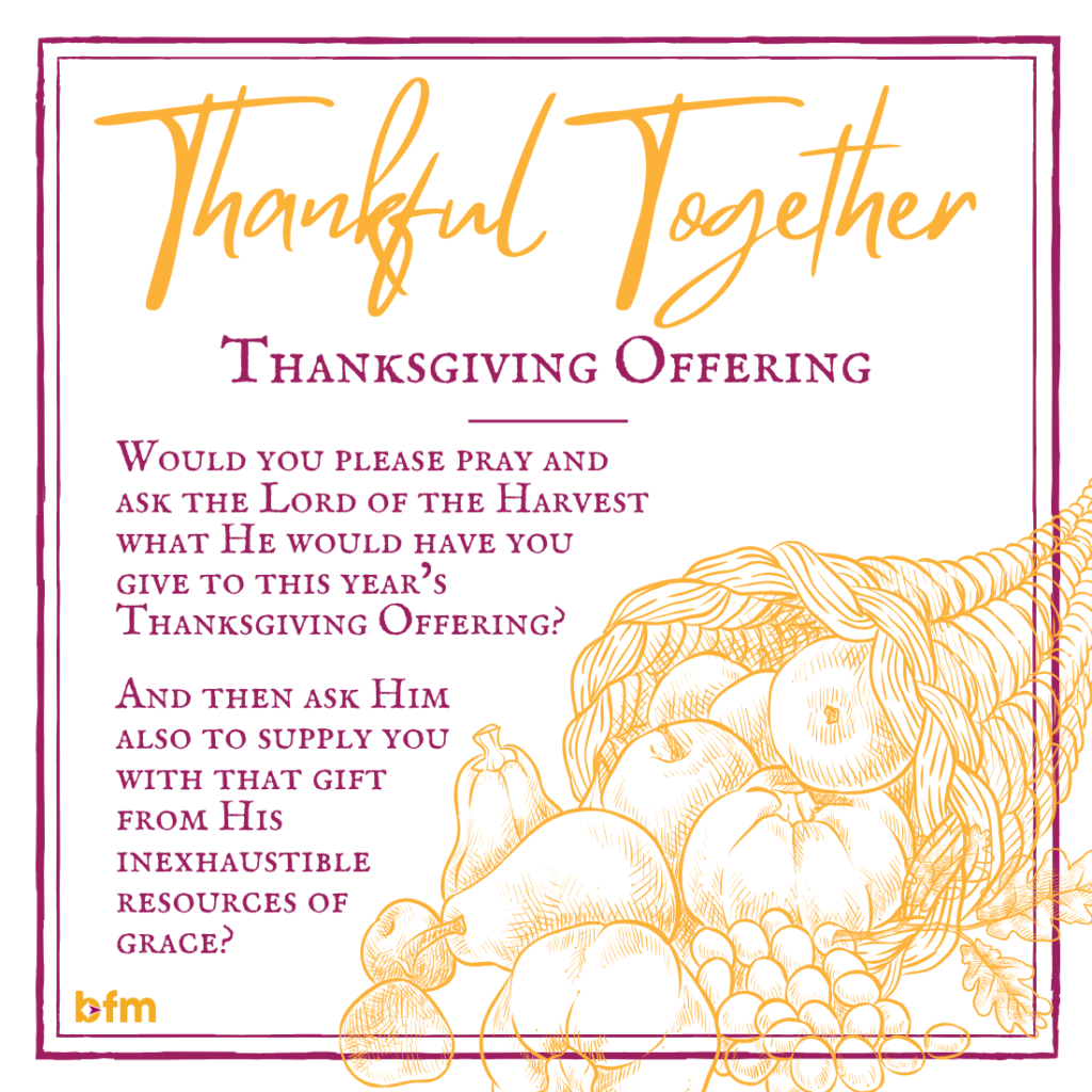 The Thanksgiving Offering is a great way for you to ensure BFM has what it needs to fully support your missionaries, both on the front lines and behind the scenes. We pray that God would stir your heart to help reach our funding goal as we seek to share the good news of Jesus Christ across the globe.